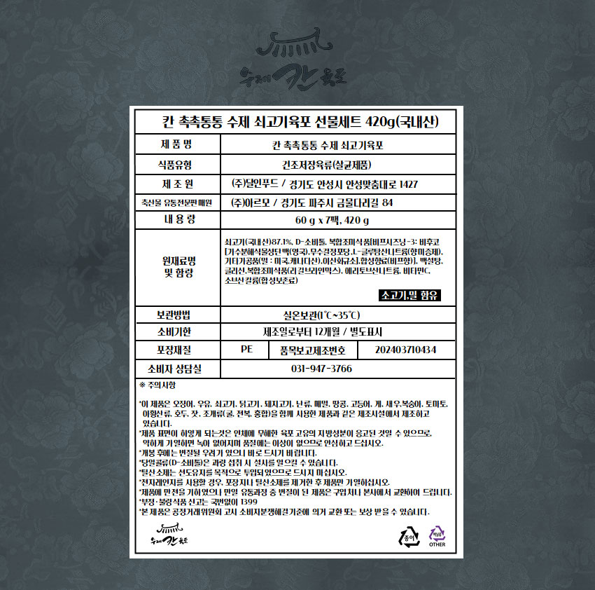 칸 촉촉통통 수제 쇠고기육포(60g x 7팩) 420g