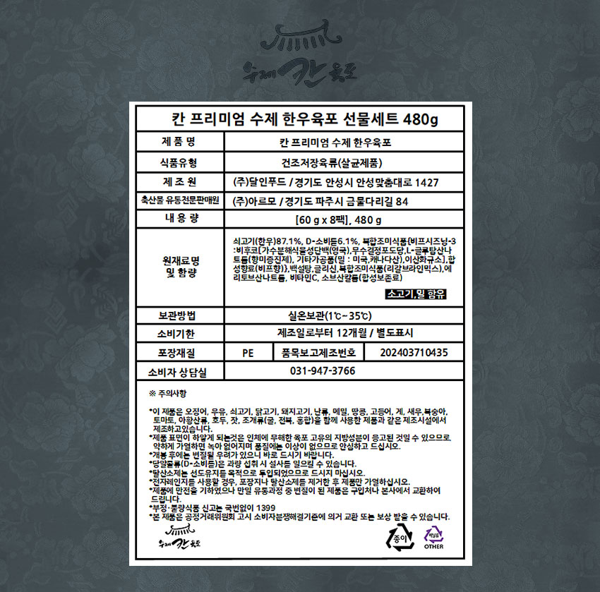 칸 프리미엄 수제 한우육포(60g x 8팩) 480g