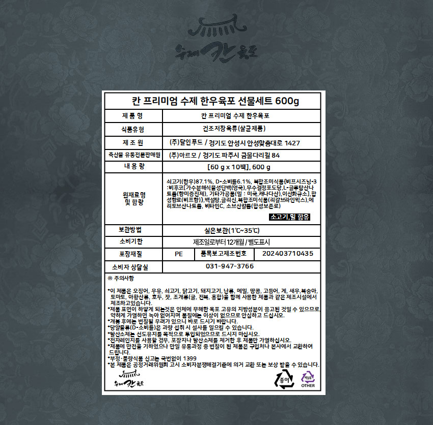칸 프리미엄 수제 한우육포(60g x 10팩) 600g