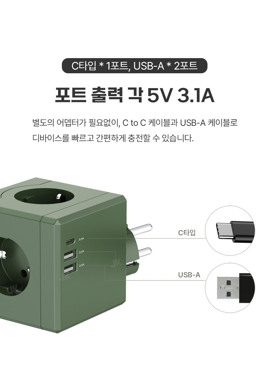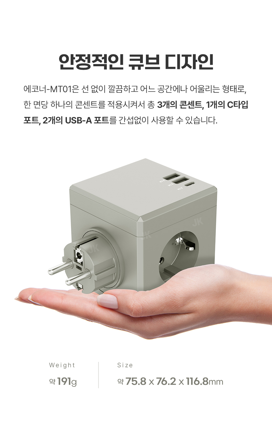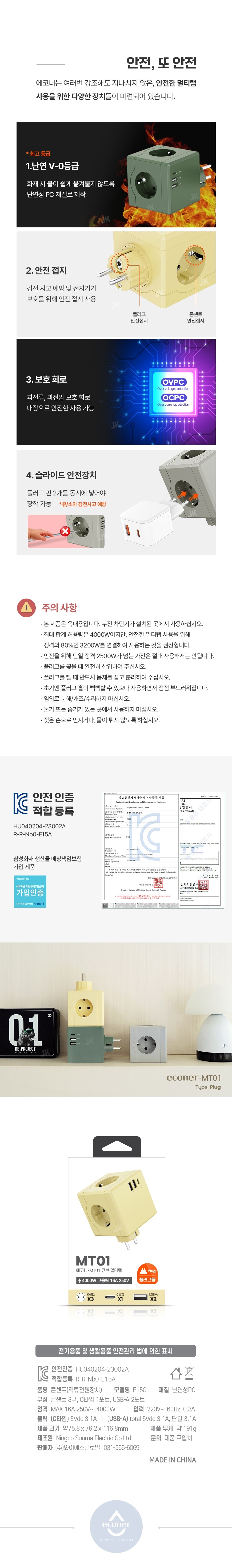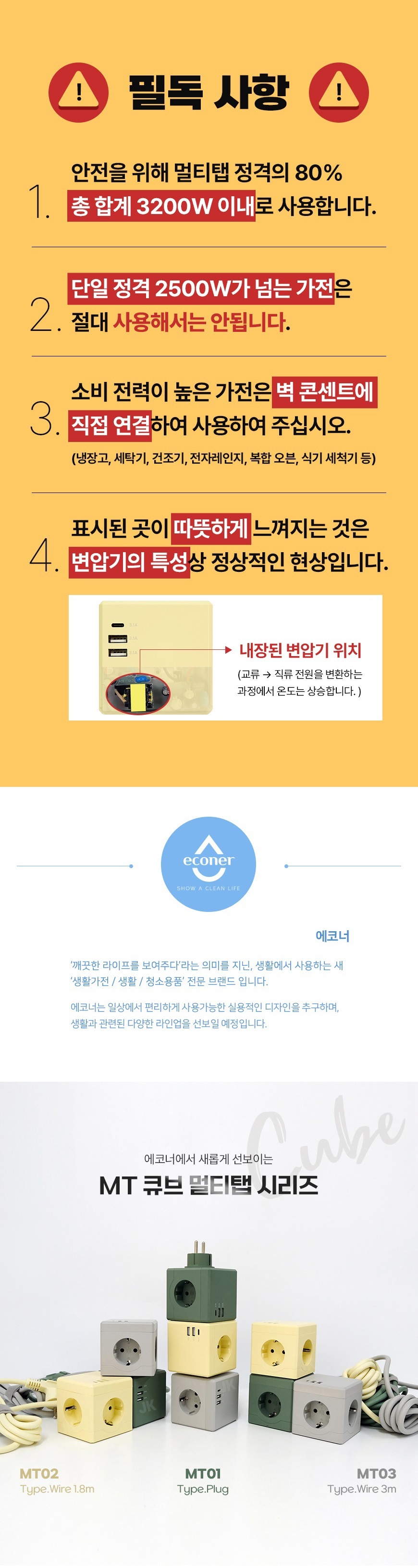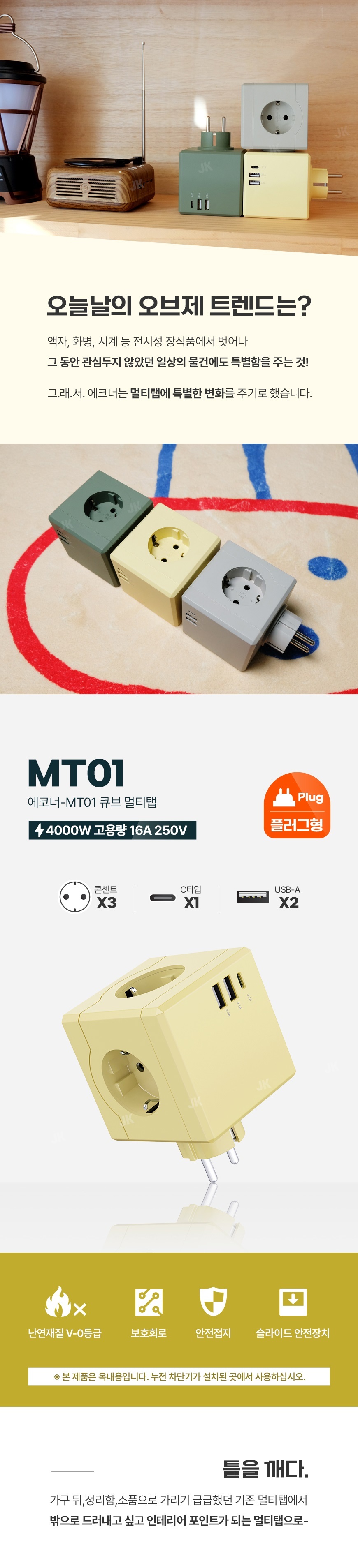 [에코너] MT01 플러그형 큐브 멀티탭 4000W 고용량 (3구/C타입포트/USB포트)